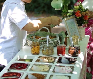 Le principe est simple mais plein de magie. Je me déplace sur le lieu de votre événement avec mon bar mobile, préparé spécialement pour l’occasion. Vous choisissez à l’avance l’univers qui vous correspond le mieux : cookies, brownies ou madeleines, ou même un mélange de ces douceurs si vous avez envie de variété. Le jour J, vos invités découvrent un espace gourmand où chacun peut personnaliser sa création. Des pâtes à tartiner maison, des confitures délicates, des fruits frais, des pépites de chocolat ou encore des brisures de biscuits sont à disposition pour composer un dessert à son goût.